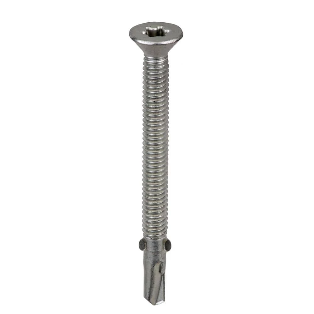 Wood to metal screws are made from c1022 steel, case hardened for fastening wood to steel or aluminum. The star drive flat head reduces camout and end load, handles greater torque than Phillips or square drive and eliminates spinning and fastener damage. For star drive use a t30 drill bit (not included). Reamer wings drill through wood and snap off when they encounter metal. The 3 drill point penetrates up to 1/4 in. Metal with no predrilling.