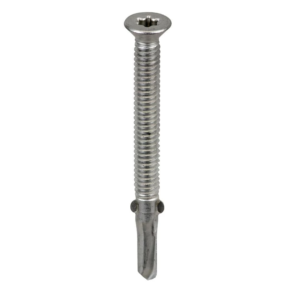 Wood to metal screws are made from c1022 steel, case hardened for fastening wood to steel or aluminum. The star drive flat head reduces camout and end load, handles greater torque than Phillips or square drive and eliminates spinning and fastener damage. For star drive use a t30 drill bit (not included). Reamer wings drill through wood and snap off when they encounter metal. The 3 drill point penetrates up to 1/4 in. Metal with no predrilling.