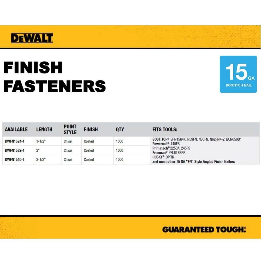 The DEWALT DWFN1524-1 finish nails are constructed from 15-Gauge steel. They apply to fine woodworking, finish, and trim applications. Each package contains 1,000 nails.