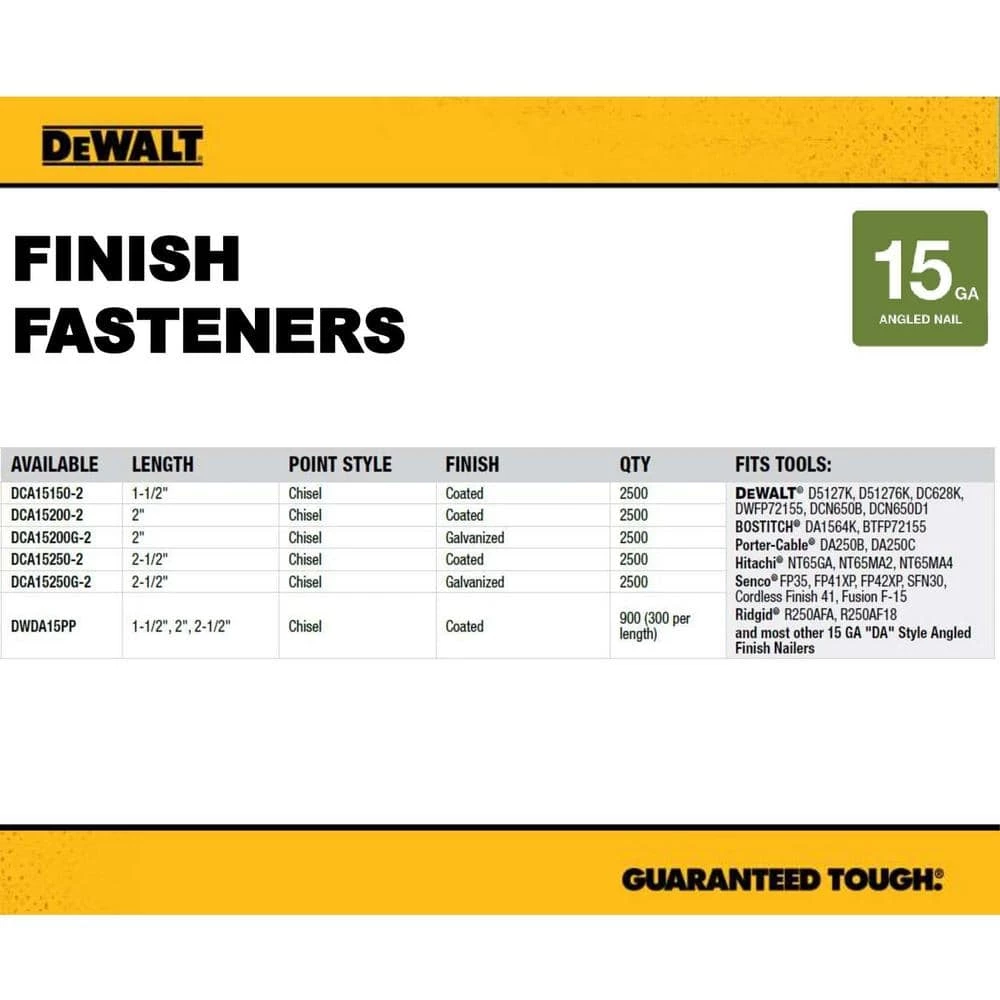15-Gauge Angled Finish Nails to complete fastening tasks in finishing applications. These steel nails feature bright finishes which are glued collated. The convenient 2500-piece pack allows you to always keep your nailer loaded.