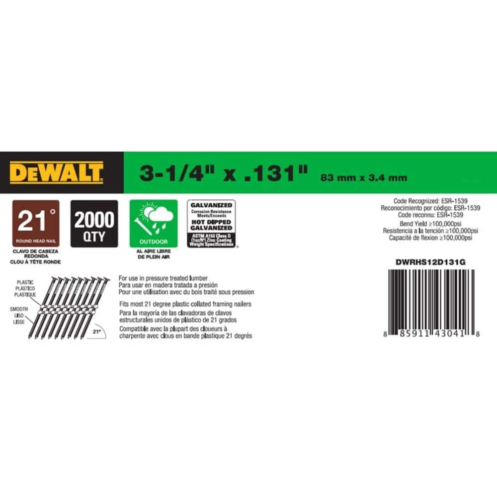 The DWRHS12D131G 3-1/4 in. x 0.131 in. Galvanized Framing Nails are part of the DEWALT family of tools and fasteners. DEWALT has a well-earned reputation for designing and manufacturing many of the world’s most reliable and best-performing professional-grade power tools. Every product is forged with DEWALT’s unwavering commitment to producing tools and accessories that can withstand harsh jobsite conditions and meet the unyielding day-to-day demands of professional contractors.