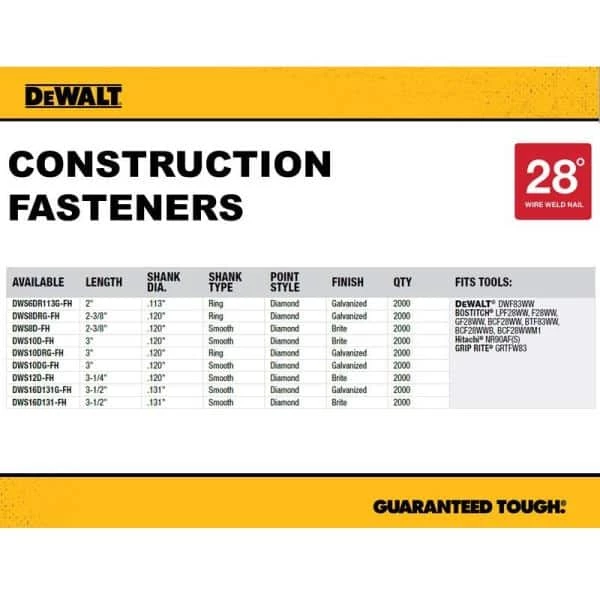 The DEWALT DWS10DRG-FH nails are constructed from 0.120-Gauge steel. They have a galvanized finish. Each pack comes with 2,000 nails.
