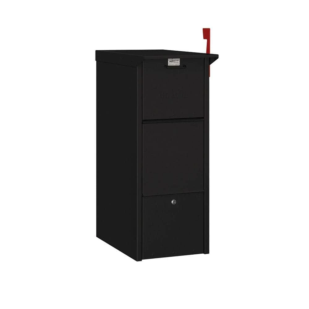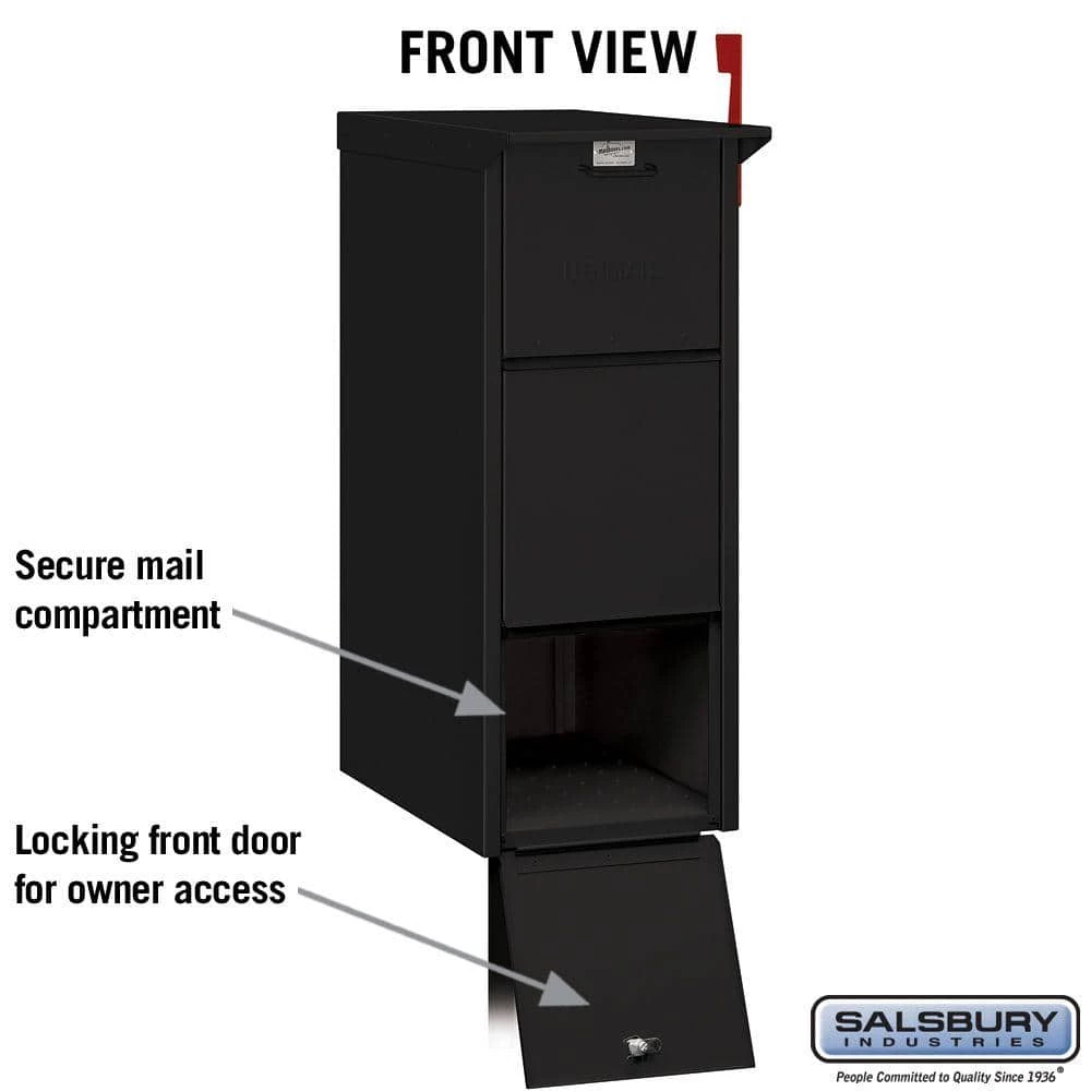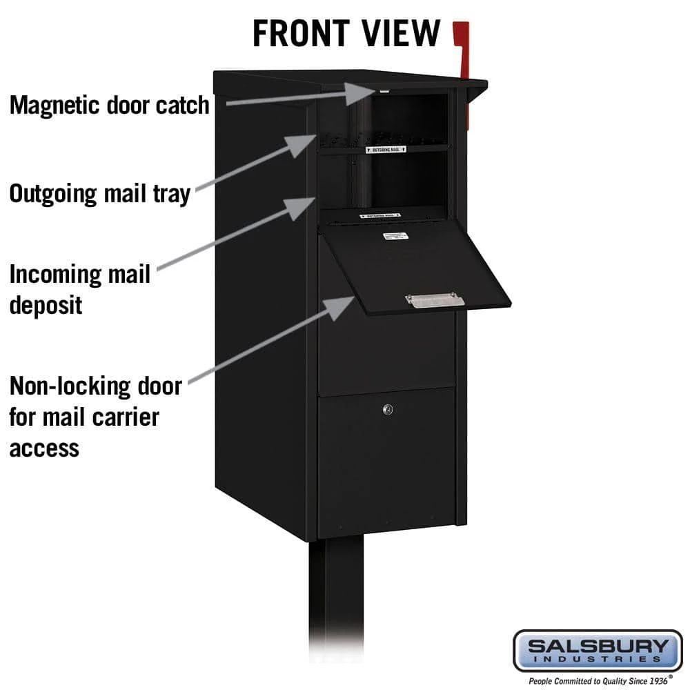 - Mail is deposited through a non-locking access panel on the front and includes an outgoing mail tray