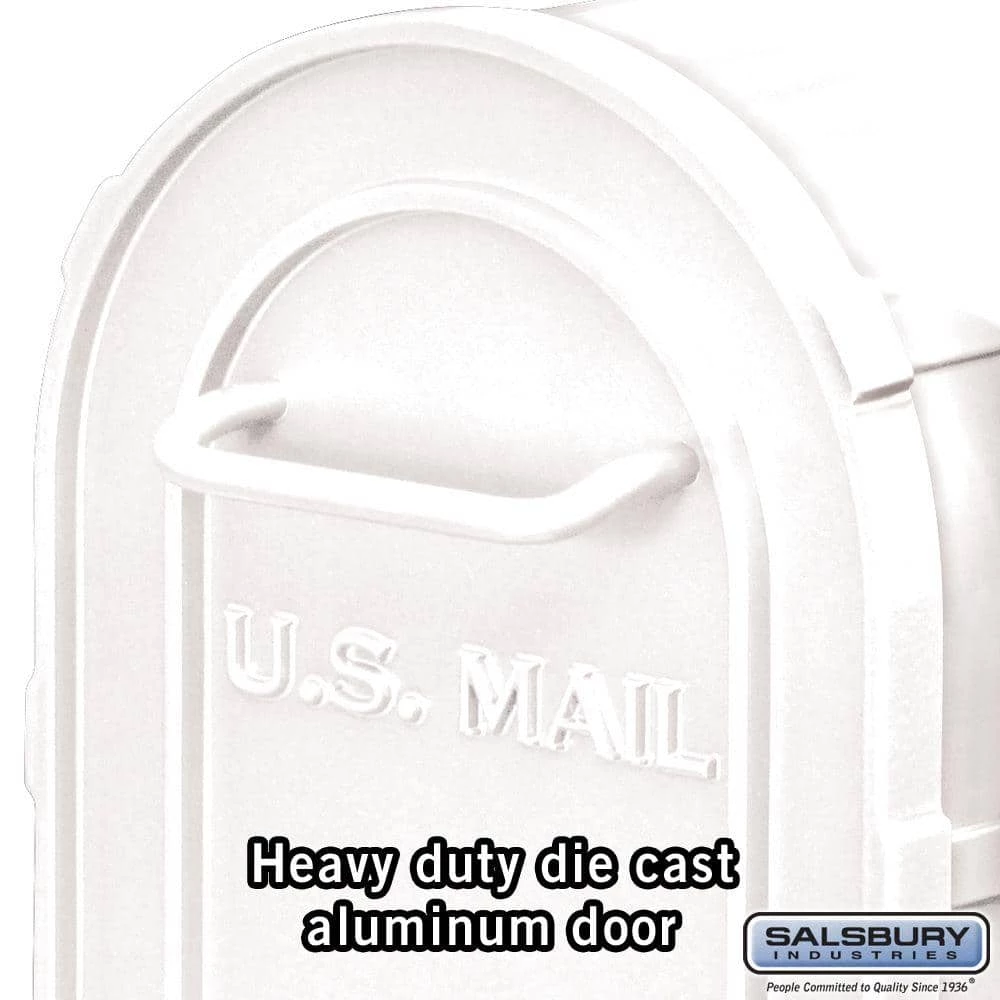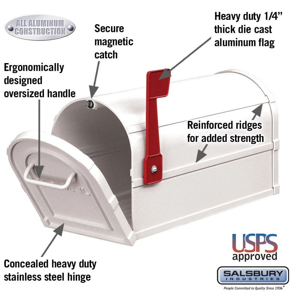 The Salsbury Industries 4800 Series Post-Mount Heavy-Duty Rural Mailbox has a secure magnetic catch and reinforced ridges for added strength and features durable aluminum construction. Approved by the Postmaster General, this mailbox is a generous size to accommodate letters, magazines and packages. Pre-assembled for easy installation, this mailbox is rust- and impact resistant.